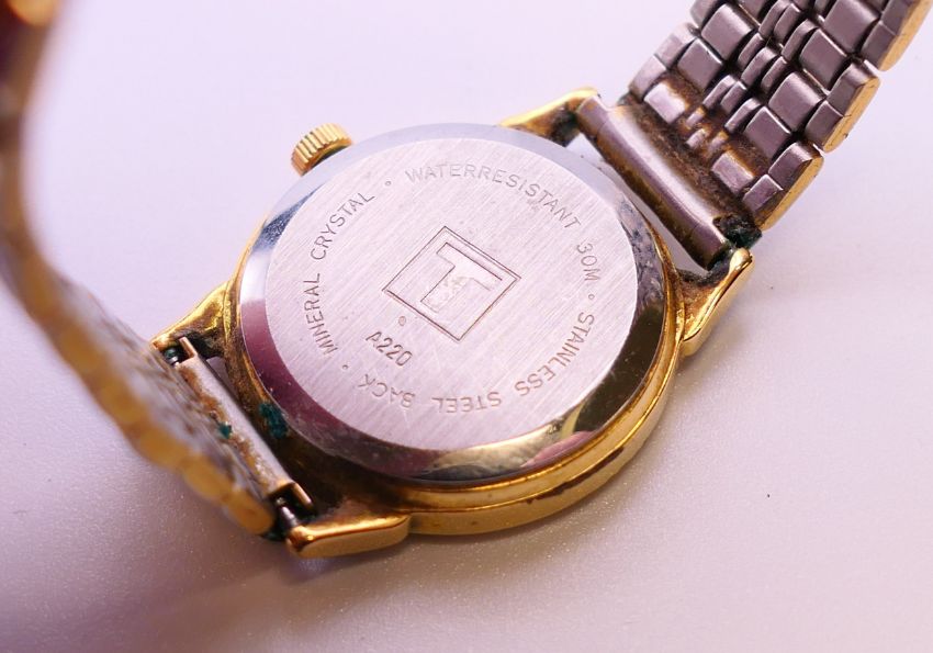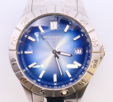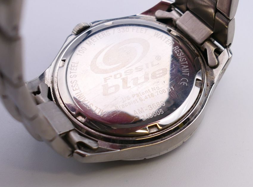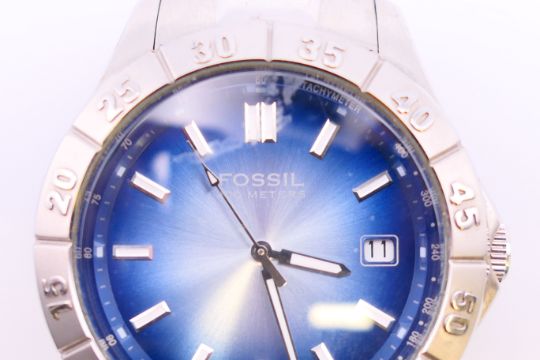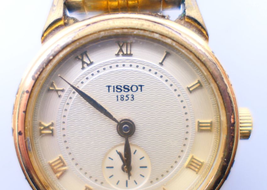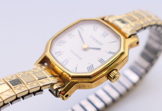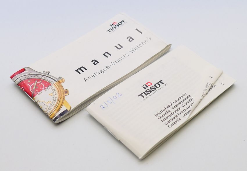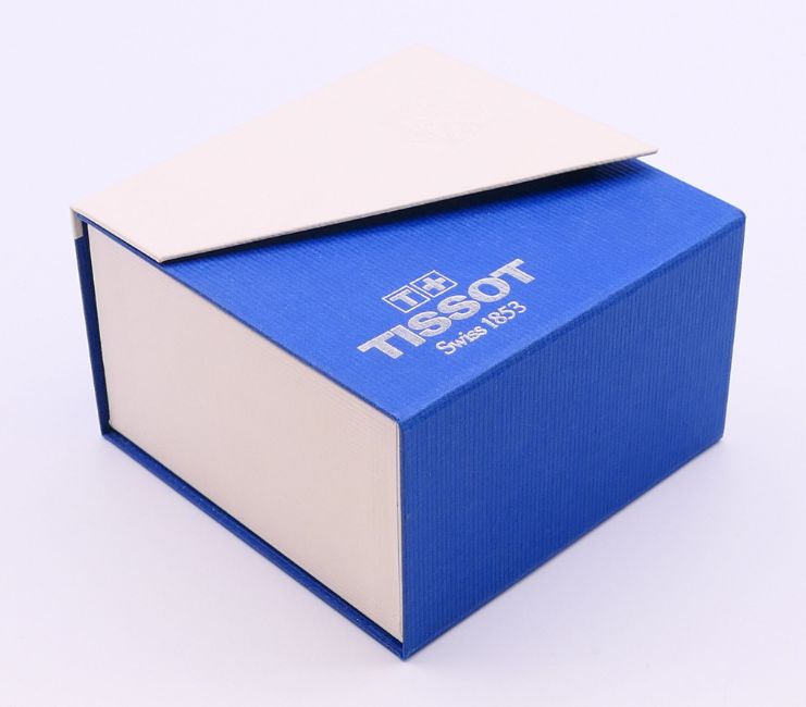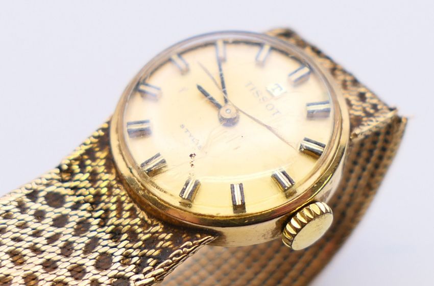 Three ladies' Tissot wristwatches, a boxed Gentlemen's Tissot wristwatch and a boxed gentlemen's Fossil wristwatch. The latter 4.2 cm wide.