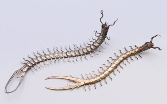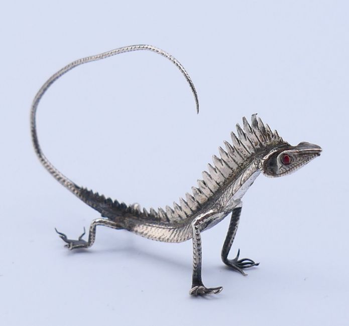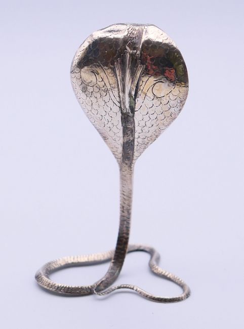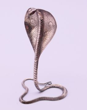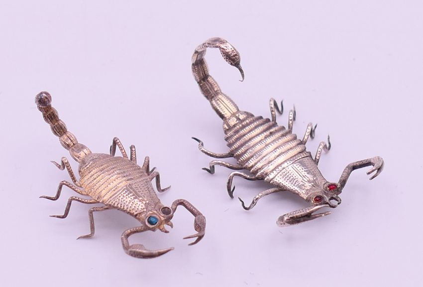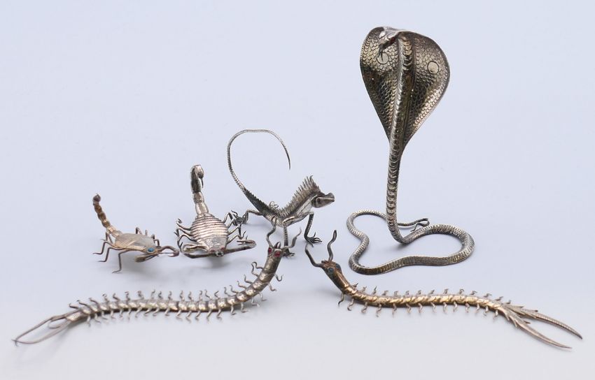Six various Eastern unmarked silver animals, including scorpions and a cobra. The latter 8.5 cm high.