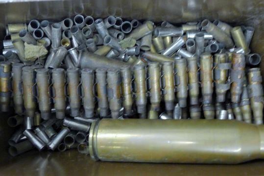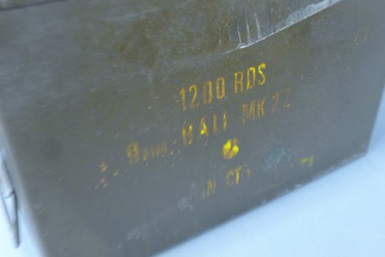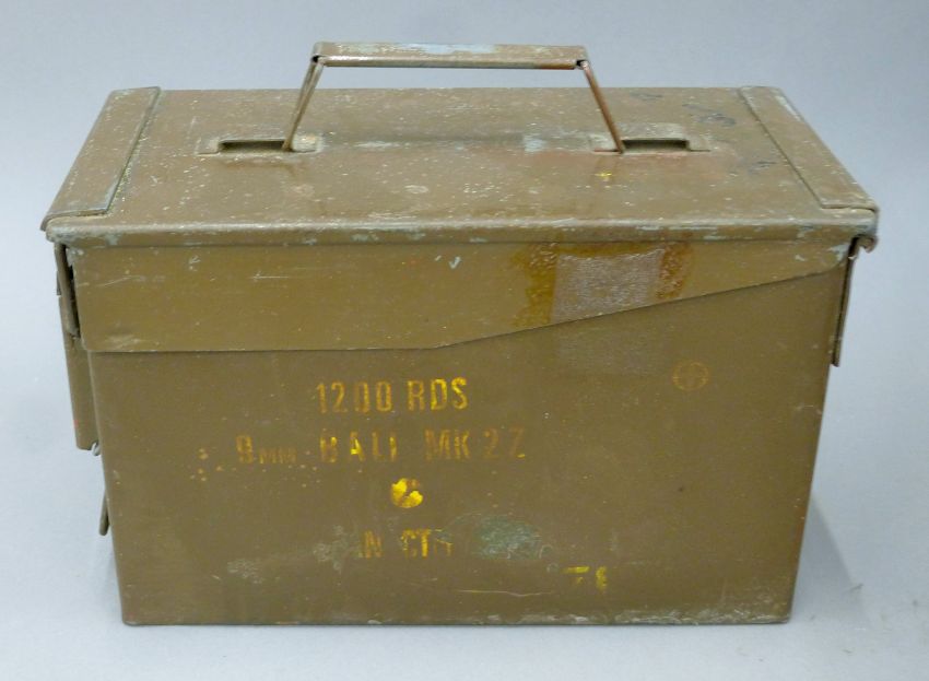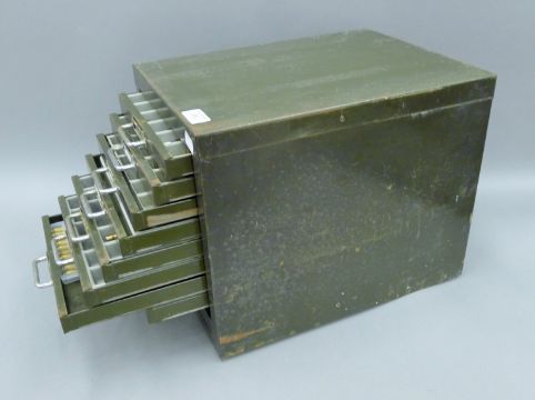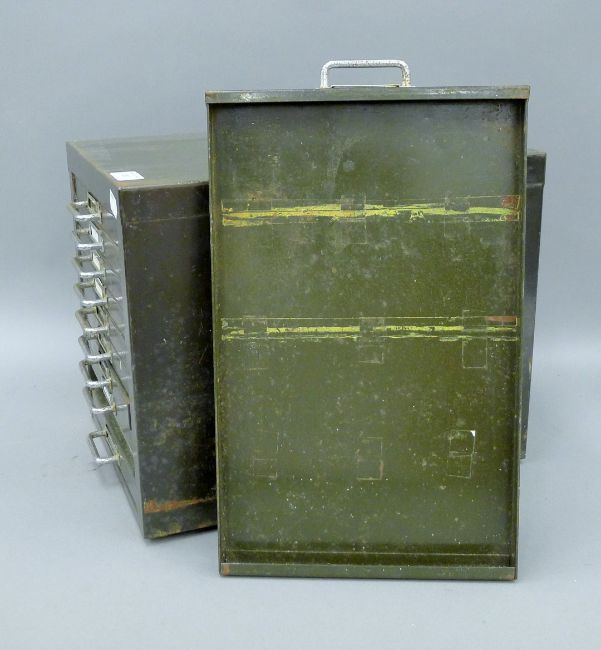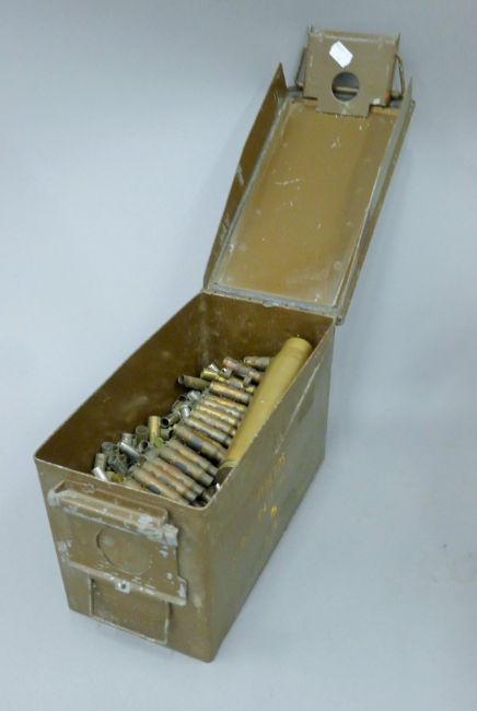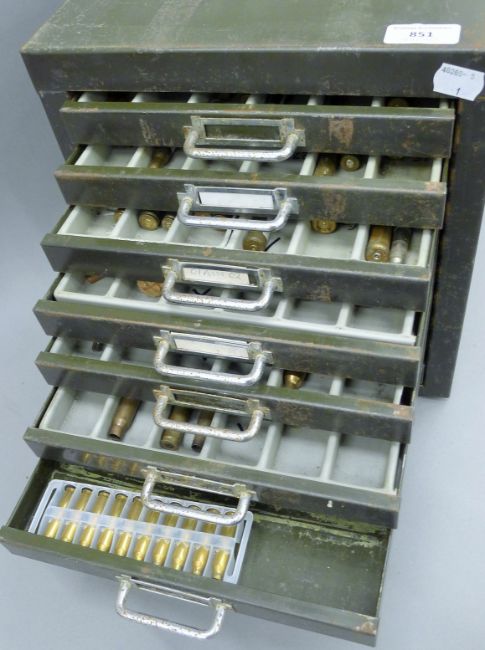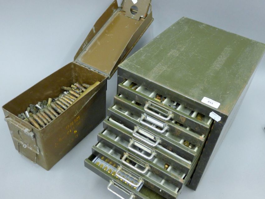 A large collection of various cartridges/spent bullets, housed in an ammo tin and a vintage metal filing cabinet. The latter 29 x 31 cm.