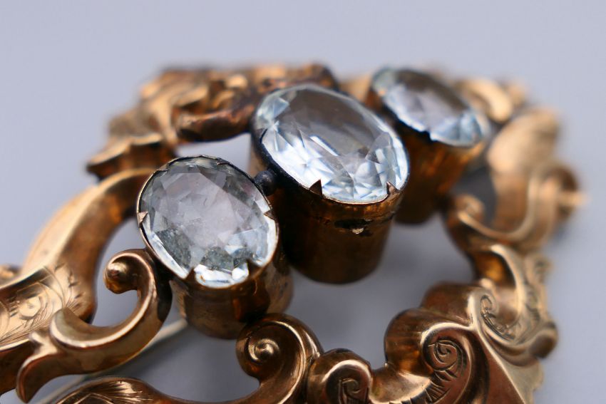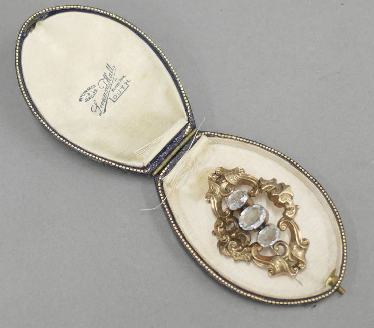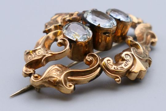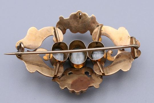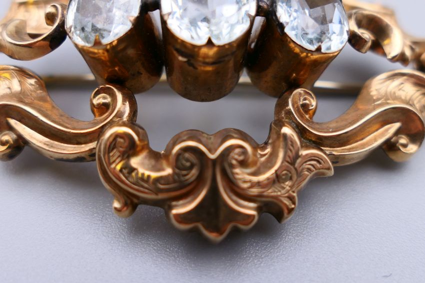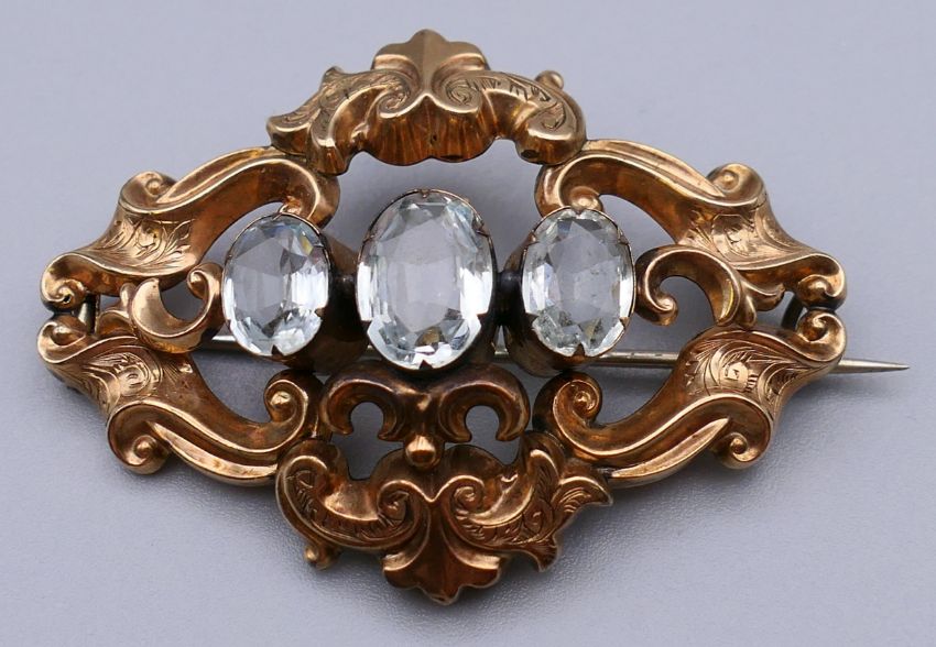 A Victorian unmarked gold paste-set brooch. 5 cm wide. 7.2 grammes total weight.