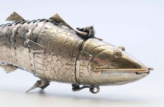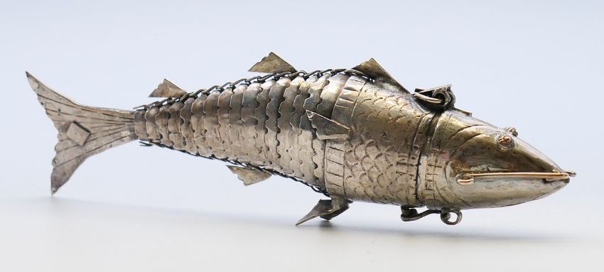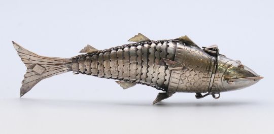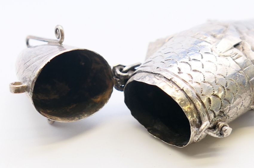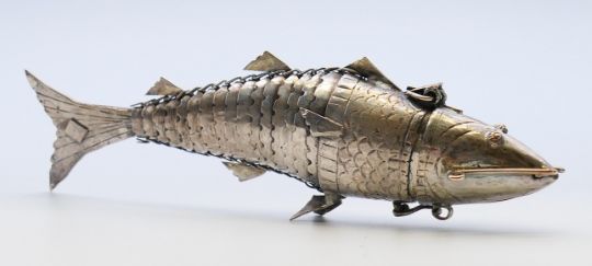 An Eastern unmarked silver reticulated fish-form box. 14 cm long.
