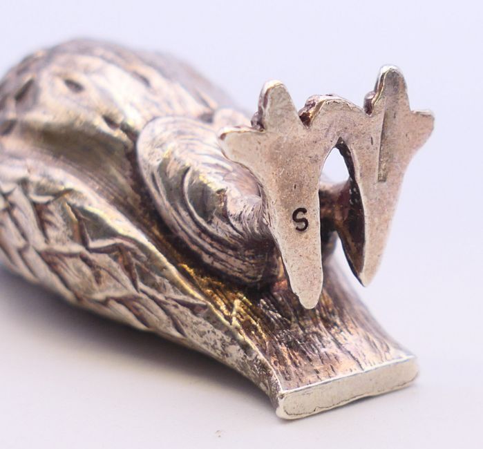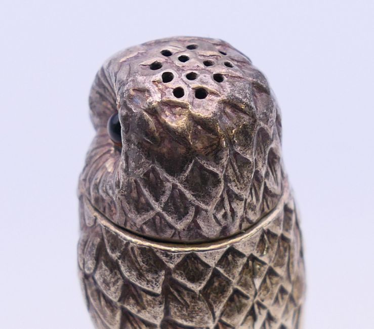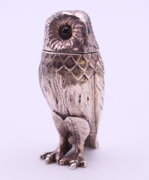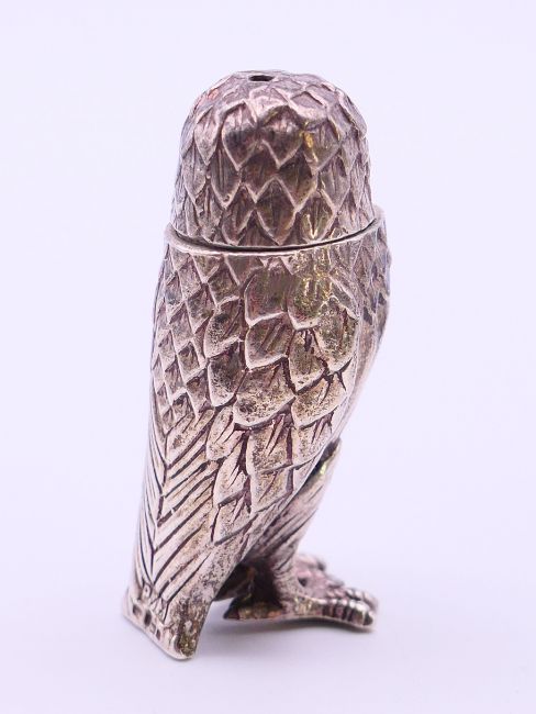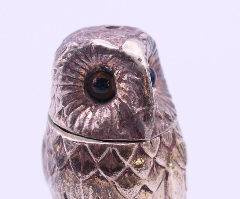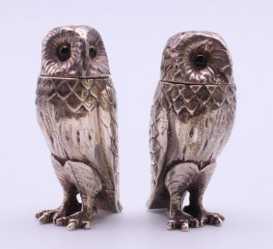 A silver owl-form salt and pepper set. Each 5.5 cm high.