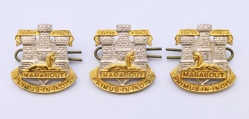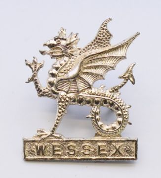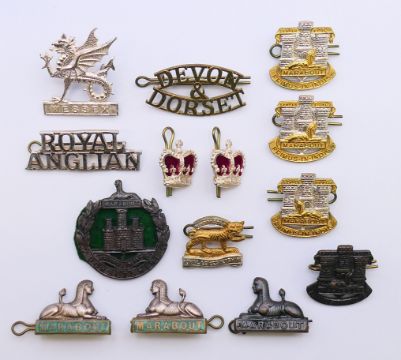 A collection of military cap badges, including The Devonshire Regiment, The Royal Anglian Regiment, The Devon and Dorset Regiment, etc. The Royal Anglian badge 5 cm wide.