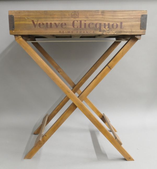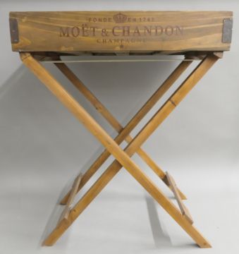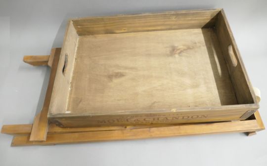 A wooden tray on folding stand. 65 cm wide.