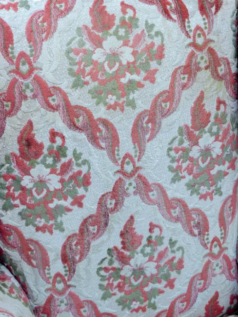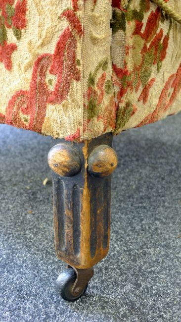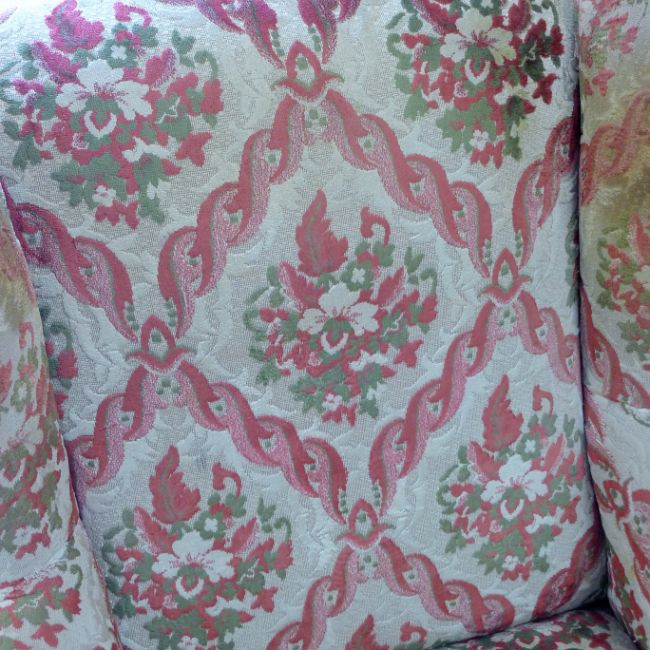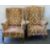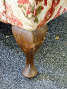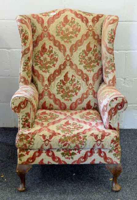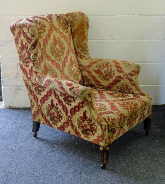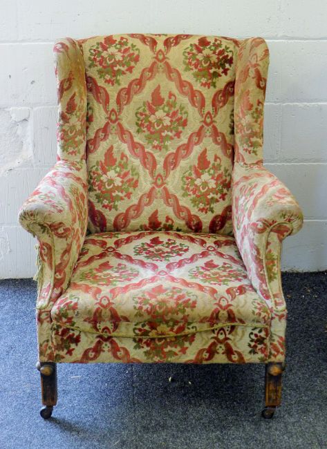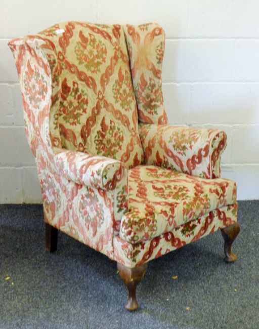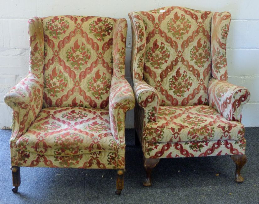 Two early 20th century upholstered wingback armchairs. The larger 79 cm wide.