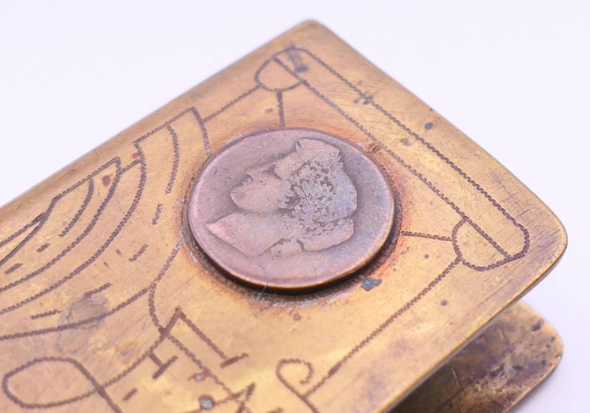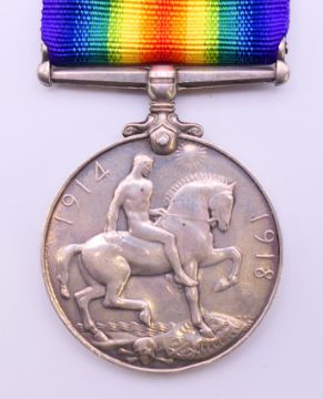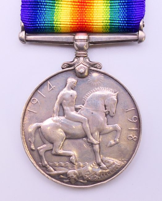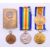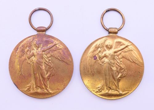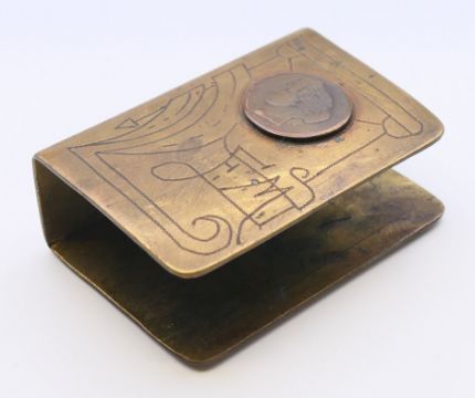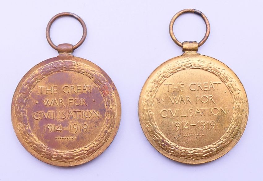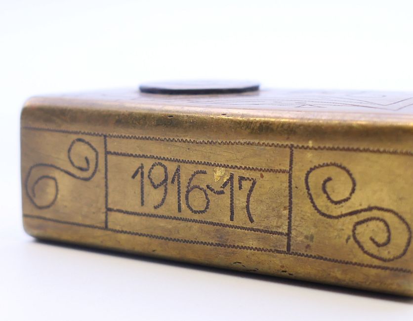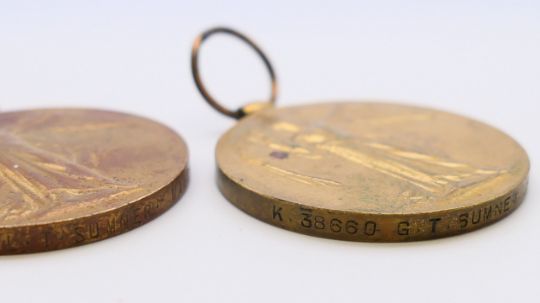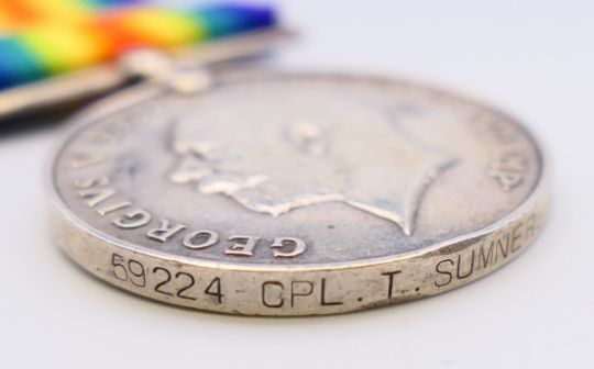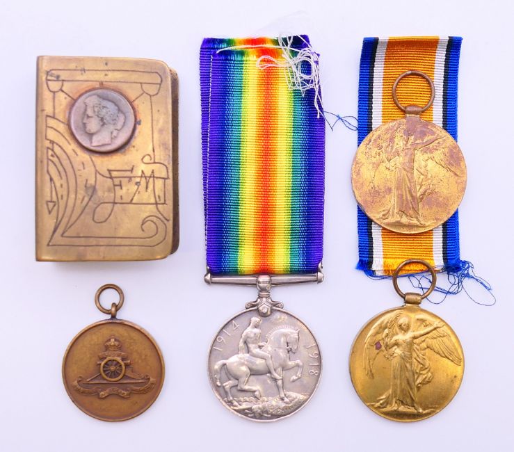 Three WWI medals, two awarded to 59224 CPL T SUMNER MANCH R together with a military medallion and a trench art match box cover. The latter 6 cm high.