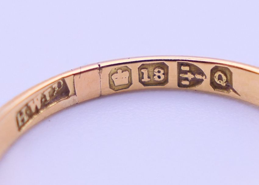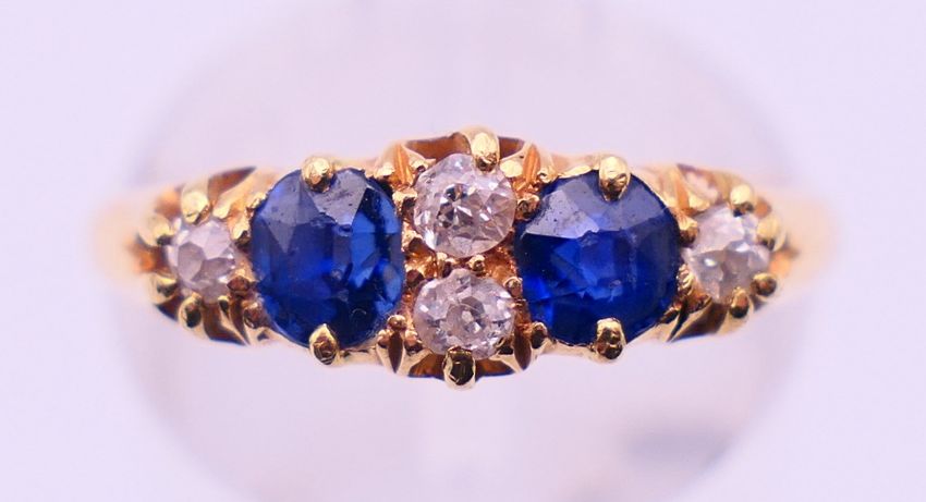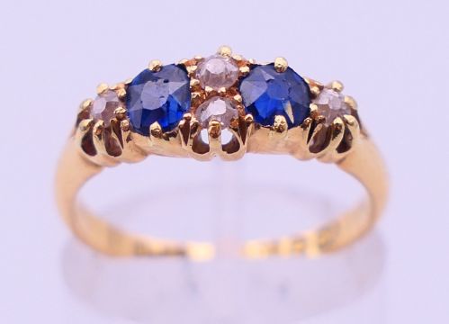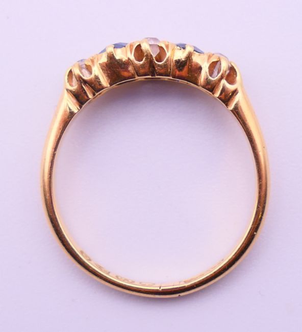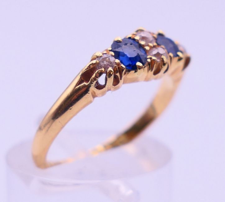 An 18 ct gold, diamond and sapphire ring. Ring size M. 2.9 grammes total weight.