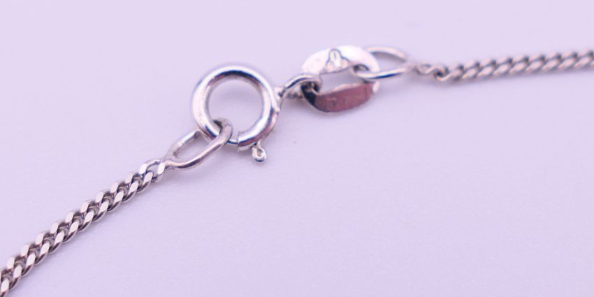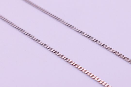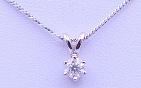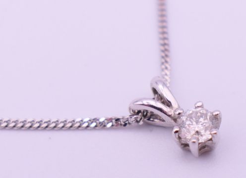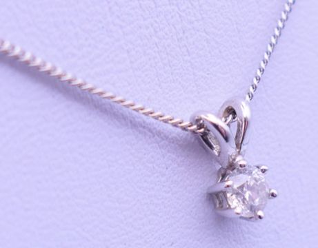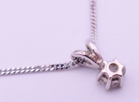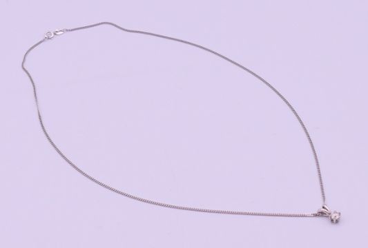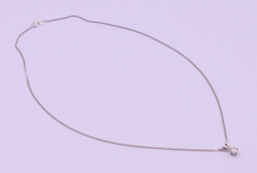 A 9 ct white gold mounted diamond pendant on a 9 ct white gold chain, in a Gucci box. Pendant 1 cm high including suspension loop, chain 40 cm long. 2.5 grammes total weight.
