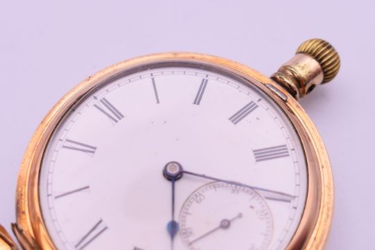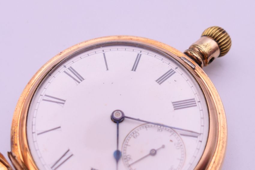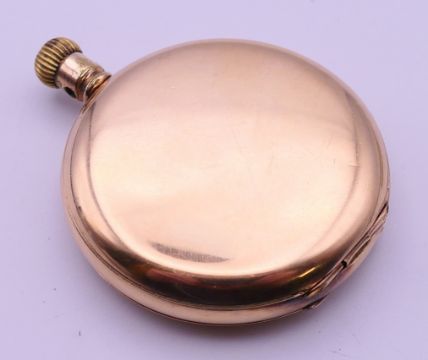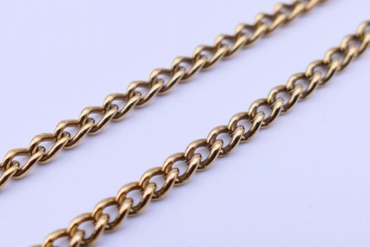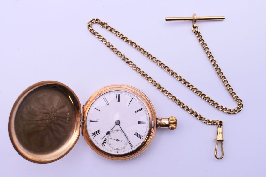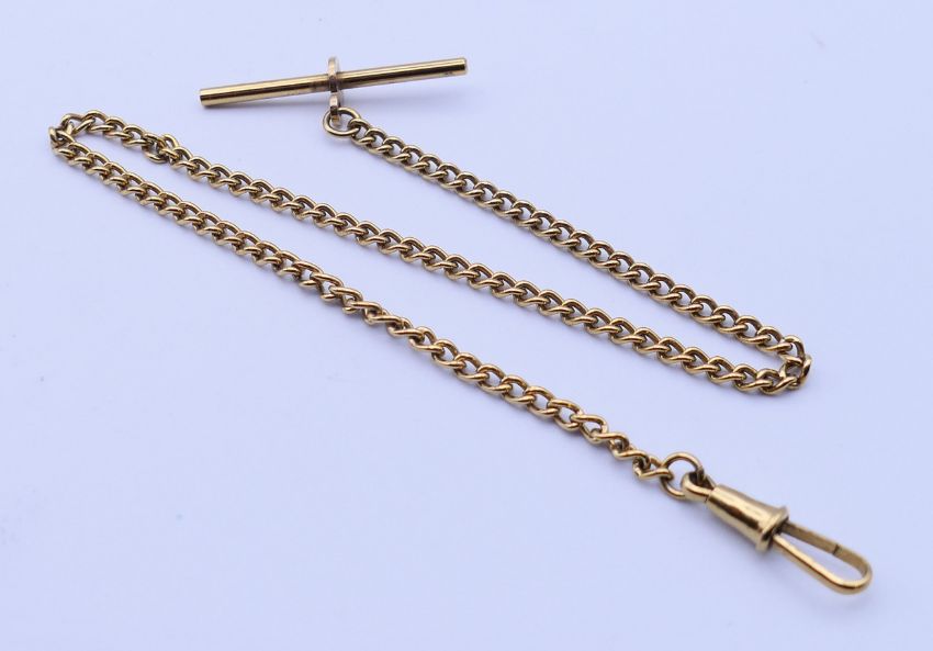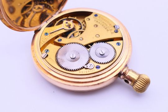 A gold plated American Waltham Traveller pocket watch and chain. Pocket watch 5 cm diameter, chain 33.5 cm long.