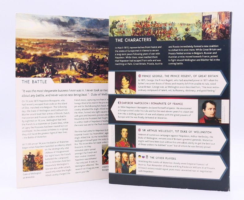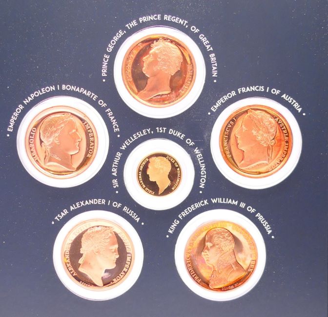 A battle of Waterloo commemorative coin set, including a Duke of Wellington 14 ct gold coin (7 grammes). Presentation folder 24 x 17 cm.