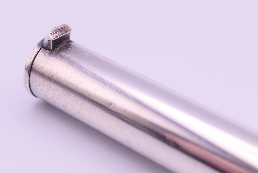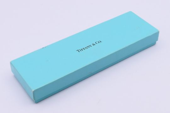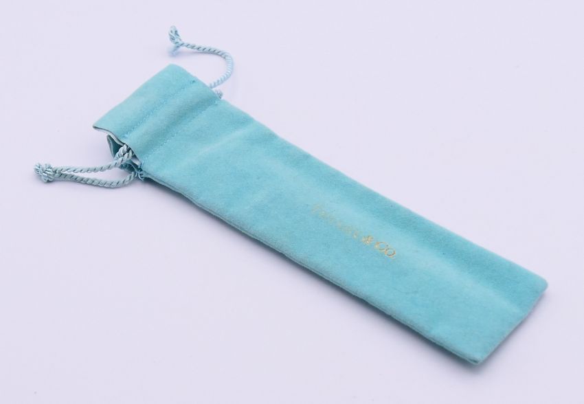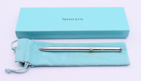 A boxed Tiffany & Co silver ballpoint pen (clip lacking). 12.5 cm long.